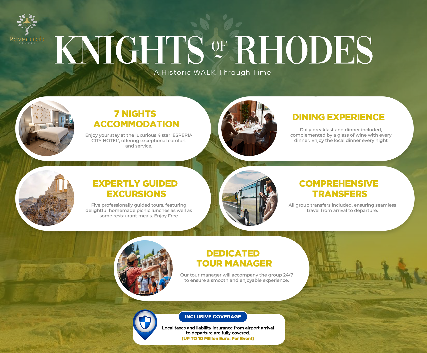 The Program is designed as 7 nights half board stay in Rhodes City, 5 tours included with lunch & Professional Guide, with mentioned museum tickets & Comfortable buses.