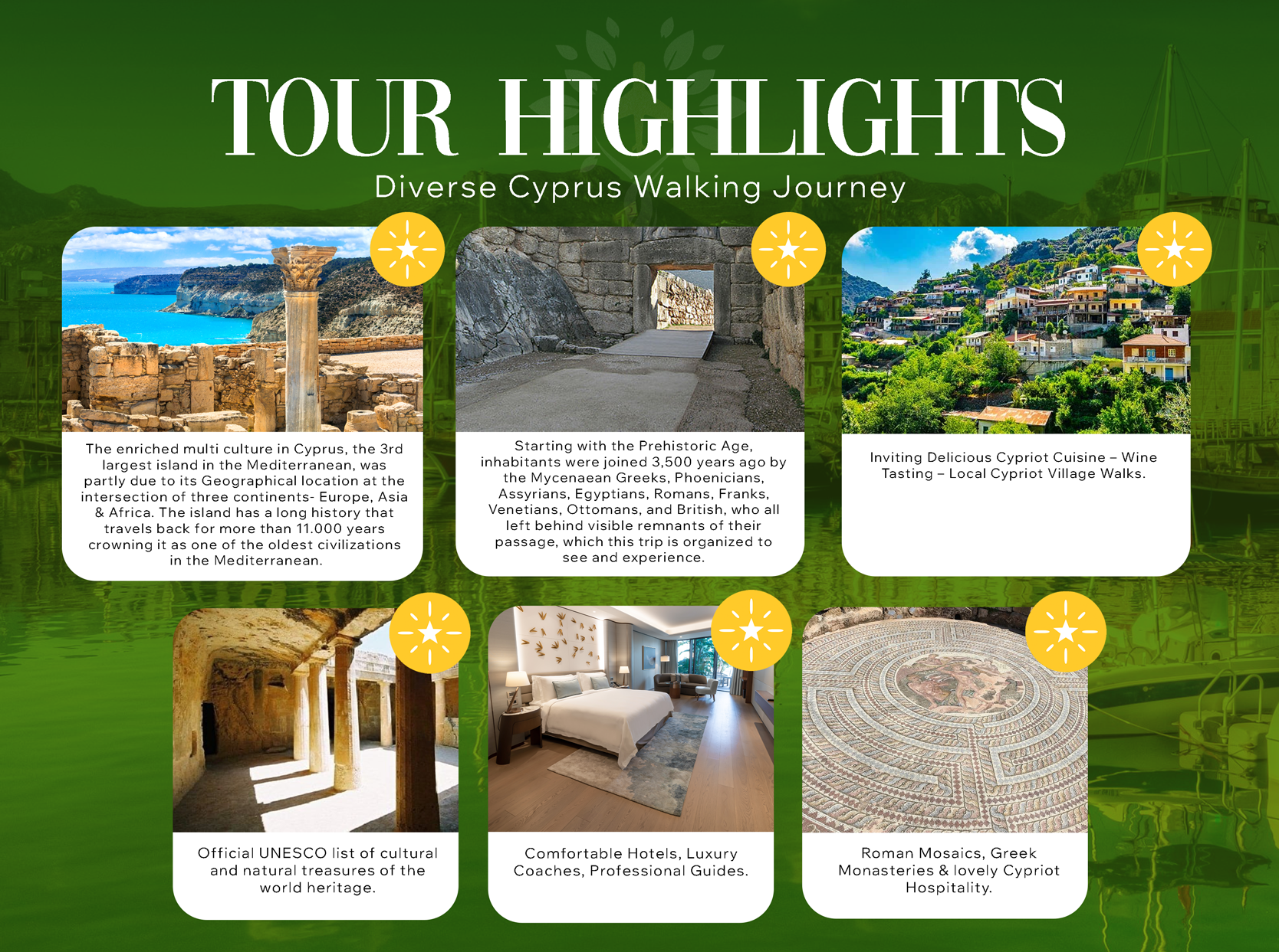 After Breakfast, we will drive through one of the richest CULTURAL CAPITALS of EUROPE; “Paphos” city. We will have a lovely walk around the Historical monuments, shops and through archaeological sites such as the Forty Columns (named after the large number of granite columns of the ancient Agora), built in the 7th century AD, the Roman Conservatory (Archaeological Park Square with mosaics). Then carry on to the old town of Kato Paphos, where Paphos Castle, House of Dionysus, which is a Roman Style Hellenistic building from the 2nd. Century AD. Then visit the famous mosaic museum of Paphos hosting a great part of the History of Cyprus. After a Lovely Lunch at the Harbour, we will visit the Magnificent Archaeological site of ‘Kings Tombs’. It’s one of the most important archaeological sites of Cyprus that has been included in the UNESCO World Heritage Sites list since 1980. The monumental underground tombs are carved out of solid rock and date back to the Hellenistic and Roman periods, which means 2.500 years ago people were living there. We will see this great memorable place and have a nice beach walk as well. Included GALA dinner at a local Tavern with live Bouzuki music and overnight at our Hotel. (Optional Tour - 35 Euro. PP)