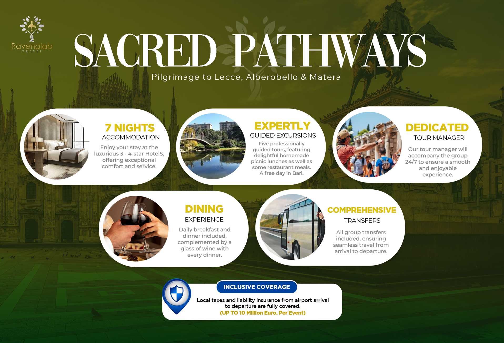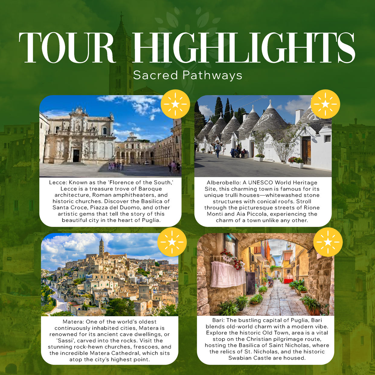 Begin in Lecce, known for its exquisite baroque architecture, before visiting the fairy-tale trulli of Alberobello and engaging in agritourist activities at an olive oil factory. Discover the ancient city of Matera, renowned for its cave dwellings, and explore the picturesque old villages of Puglia, where you'll enjoy wine tasting and traditional bread- making.