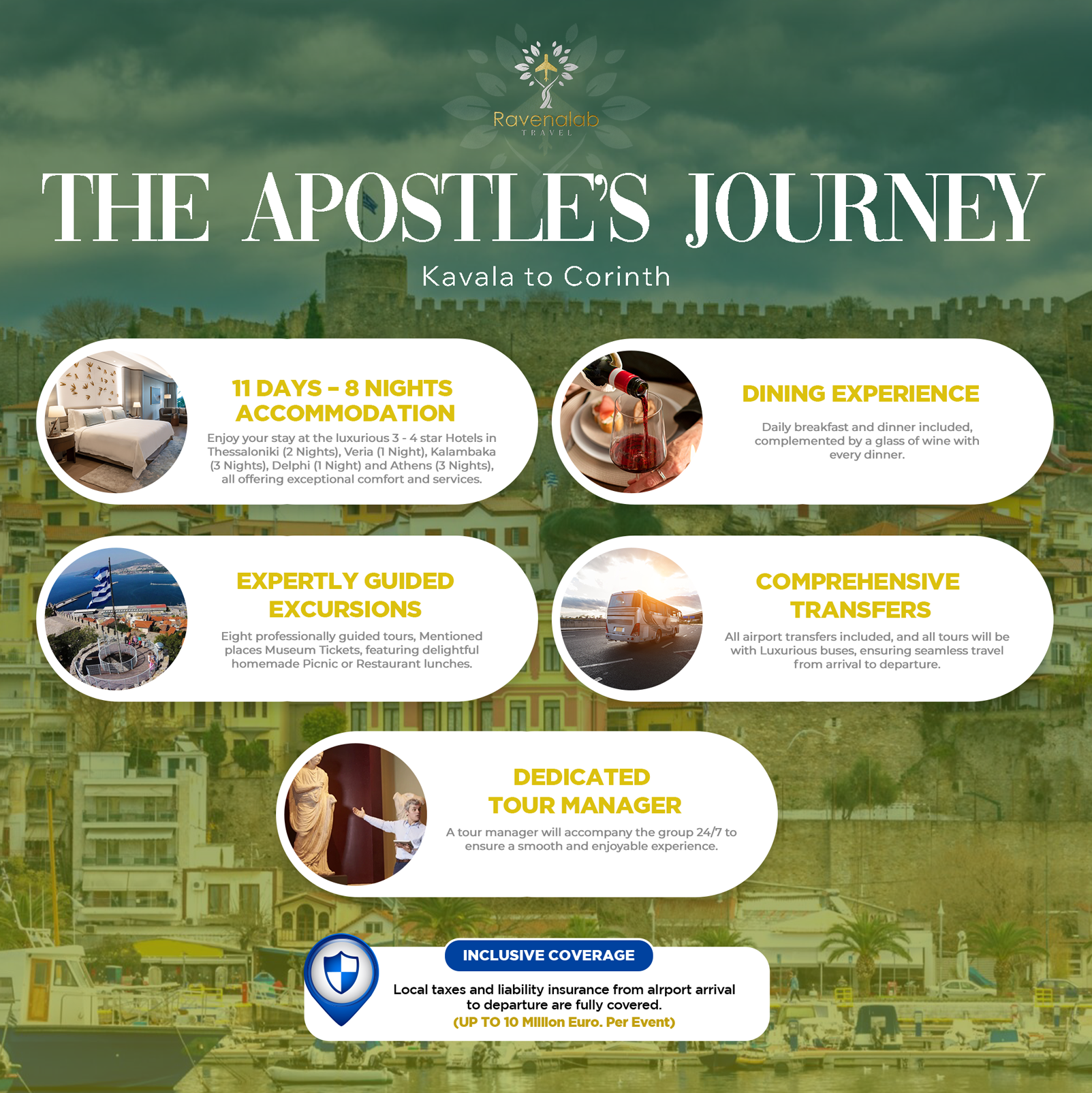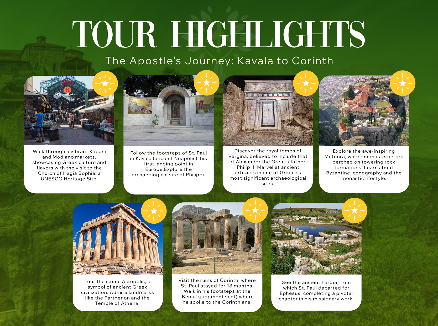 Paul's Teachings Embark on an inspiring 10 night - 11 days journey tracing the footsteps of St. Paul through Greece, visiting key sites from his missionary travels. This tour offers a blend of spiritual enrichment, history, and breathtaking landscapes as you explore the places where the Apostle to the Nations preached and built early Christian communities. Pauline Sites: Discover Thessaloniki, Philippi, Veria, Meteora Monasteries, Acropolis of Athens, Corinth and much more in the profound legacy of St. Paul’s teachings. Mass and Worship during the week with Greek Hospitality.