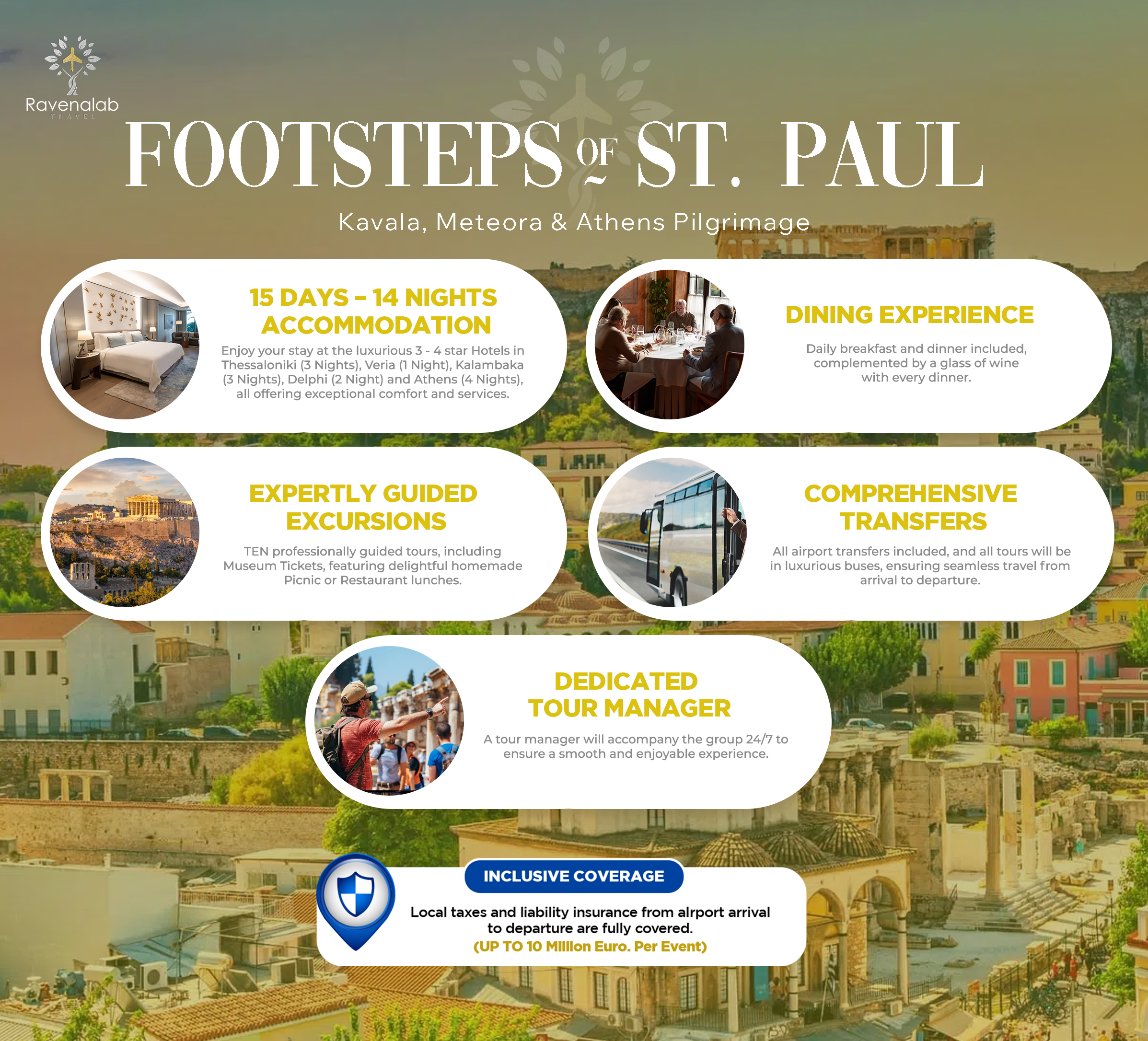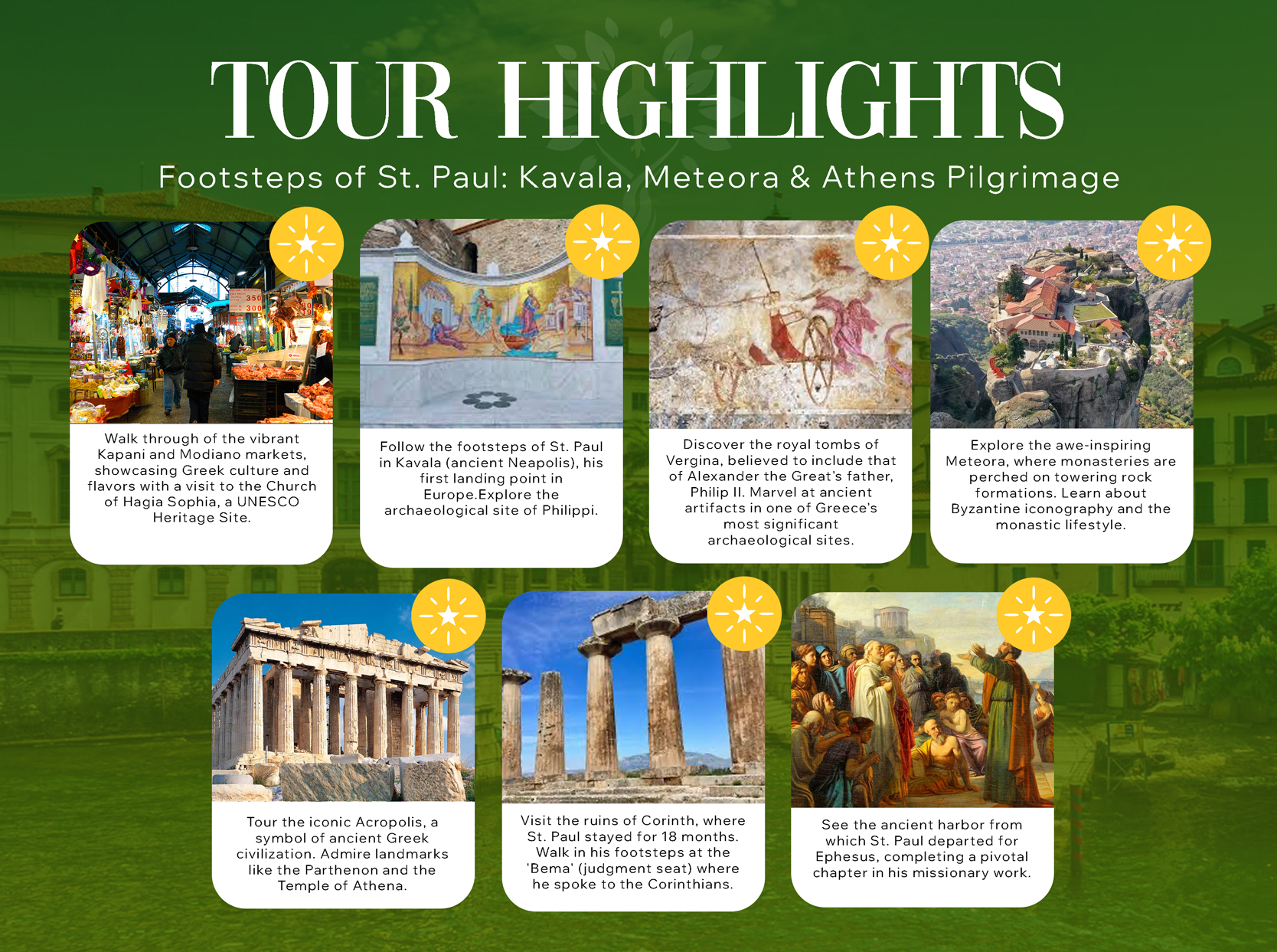 Begin your spiritual journey with a drive to the town of Kavala, formerly known as Neapolis, the principal seaport in eastern Macedonia and the first place where St. Paul set foot on the Greek mainland. From there, we proceed to the archaeological site of Philippi, where St. Paul and Silas were imprisoned. Here, we will visit the Church of Philippi, known for its deep connection to St. Paul, and take time for reflection and worship in this sacred setting. A delicious lunch awaits at a local taverna near Philippi, offering a taste of authentic Greek cuisine. Afterwards, we will continue to the village of Lydia, where we will visit the stream and church where Lydia of Thyatira was baptized, marking the first recorded baptism in Europe. The day concludes with dinner at a local taverna, followed by overnight accommodation at the hotel in Thessaloniki.