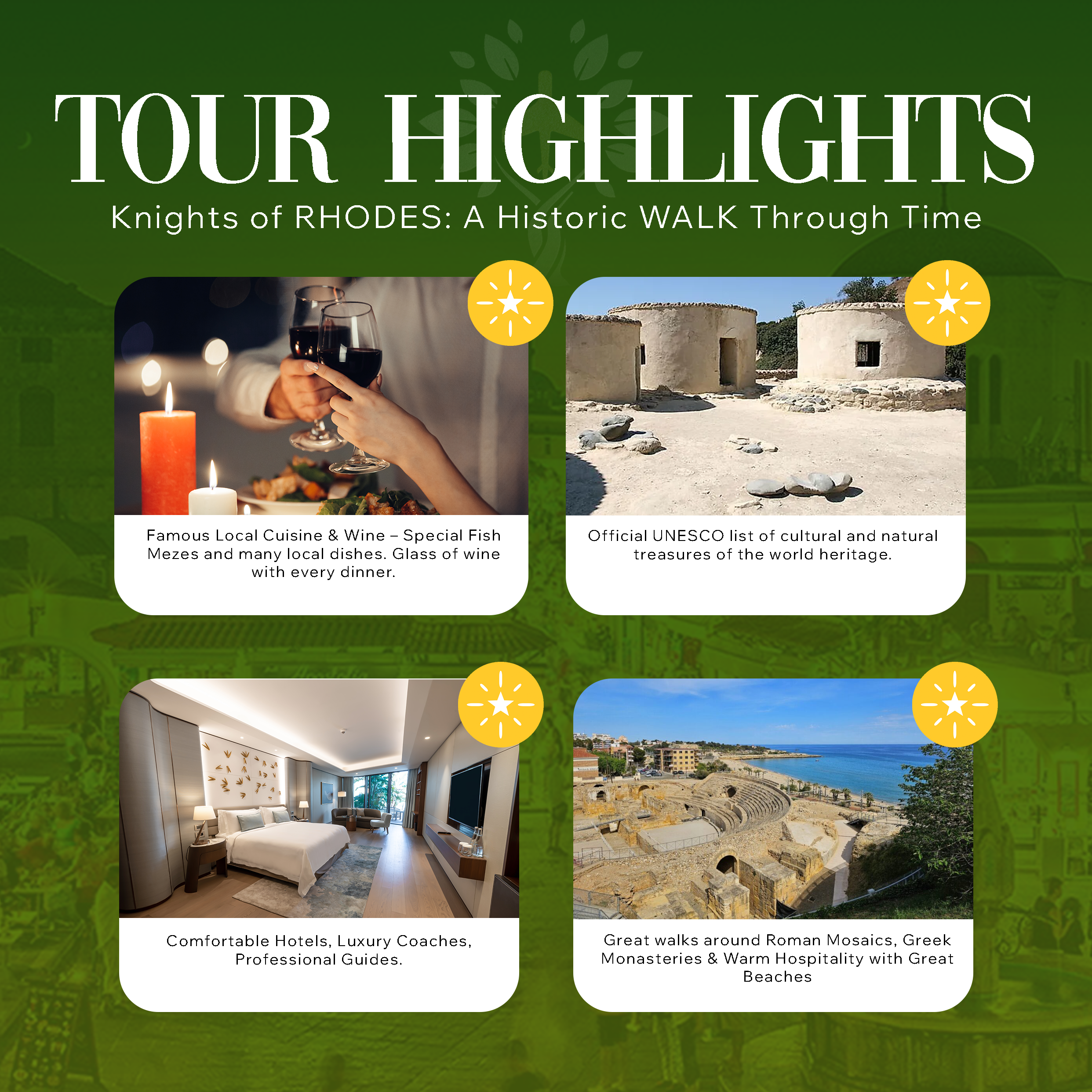 The Program is designed as 7 nights half board stay in Rhodes City, 5 tours included with lunch & Professional Guide, with mentioned museum tickets & Comfortable buses.